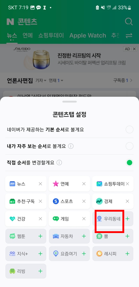 4. 각종 컨탠츠 추가 항목중, 우리동네를 추가합니다.
