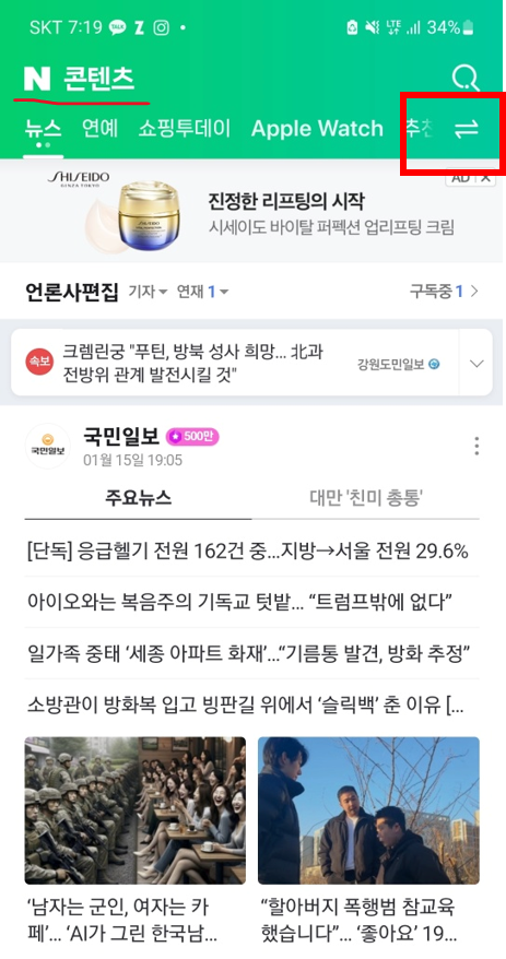 3. 네이버 컨텐츠 탭의 화살표모양 탭을 클릭합니다.