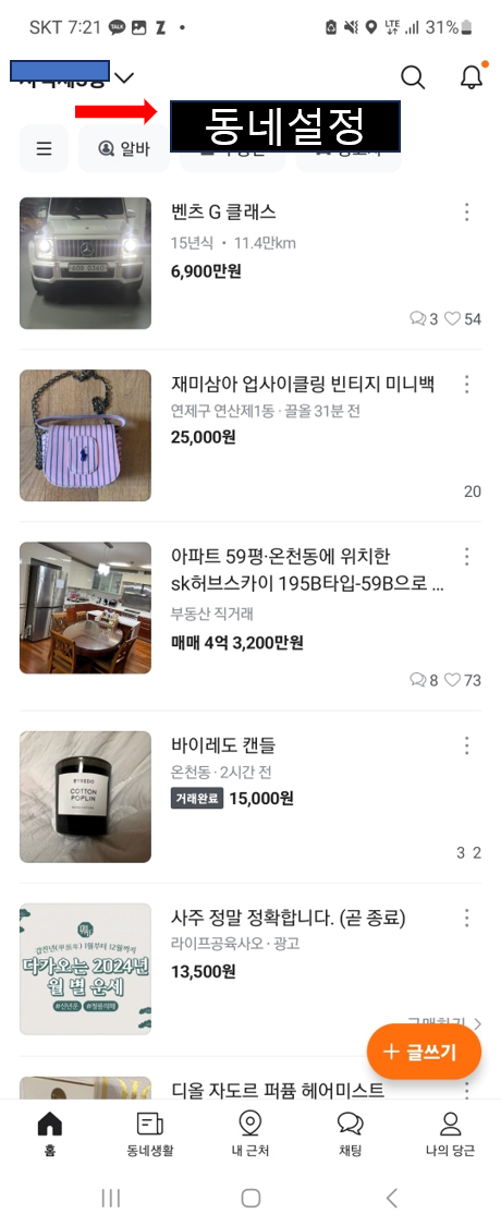 1. 당근마켓 어플을 설치 및 로그인, 동네인증을 진행합니다.